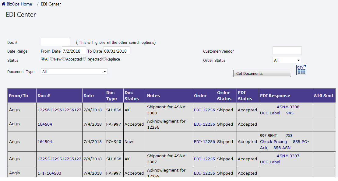 In EDI Center, user can see which EDI Orders have been fulfilled and which have not. When a Purchase Order (PO) comes in to BizOps, BizOps converts that to an Order and assigns an order number. The incoming PO number is stored in the Doc # column.