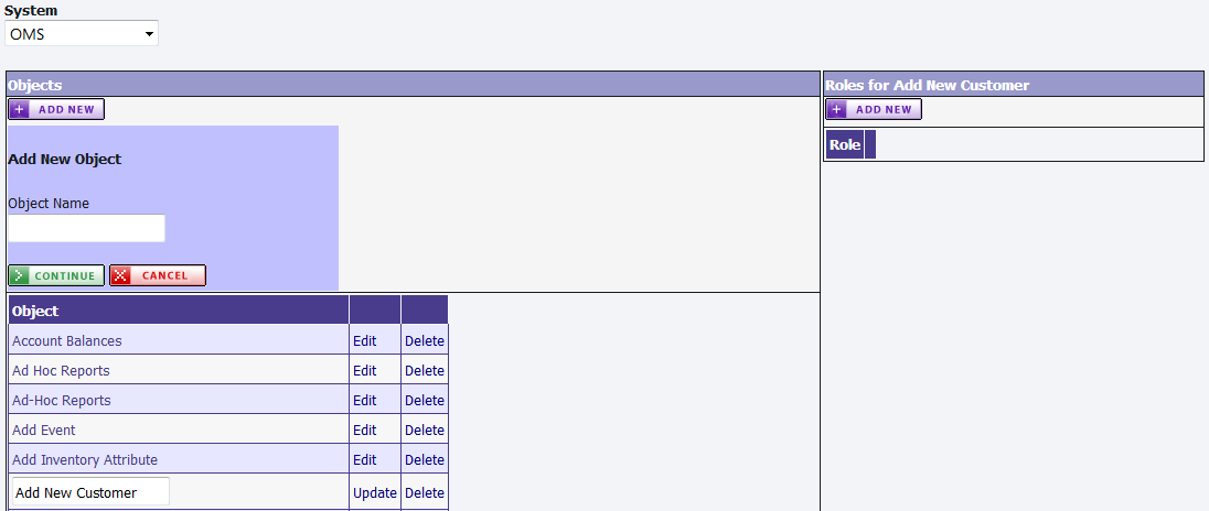 On this page, you can add / edit / delete objects and their roles for selected system. Click on Edit link of Object and add the new role for the selected object.