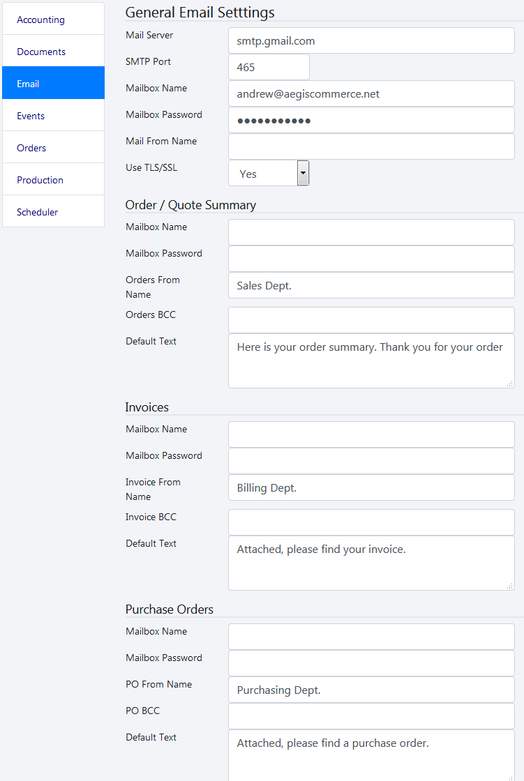 On this page, you can set the value of Email attributes(e.g. Port name, password, Bcc etc. ) for general, sales order, invoice, purchase order email settings.