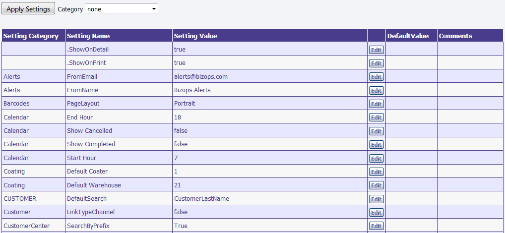 Here you can set the default values for various categories and their settings. For example, for category Alerts, you can set email address of sender in for FromEmail setting. The default value will be assign if the setting value is not defined.