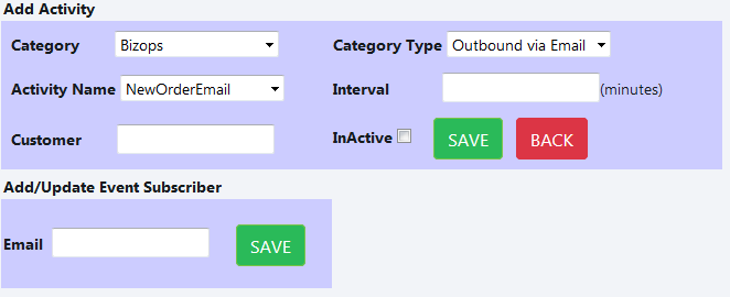 On notification page, you can add / edit / search activities and their subscriber. The activities are created to process the automated process. For example, you can create outbound email activity to send new order email to subscriber when the new order is generated.