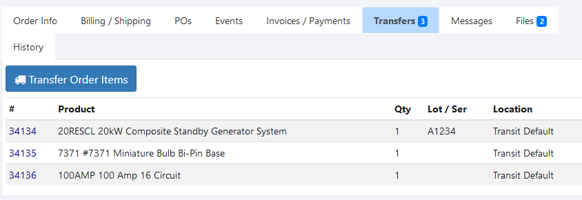 To transfer the items on an order to a location (for example, to a truck), go to the Transfers tab on the order and select Transfer Order Items: