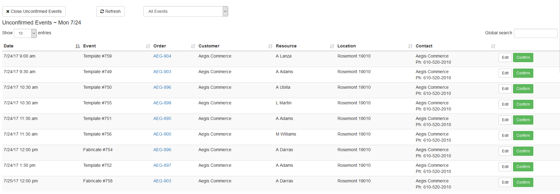 The unconfirmed events view shows all scheduled event for the selected date range that have not yet been confirmed. The details of the event are shown, along with the contact information on the order. You can view the event and make any changes to it by clicking the Edit button, and you can confirm the event directly from the list by using the Confirm button: