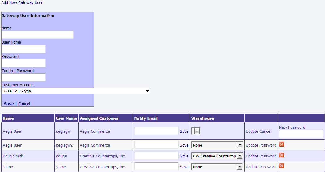 Here you can create new gateway user for selected customer. You can update email address, warehouse and password of existing users.
