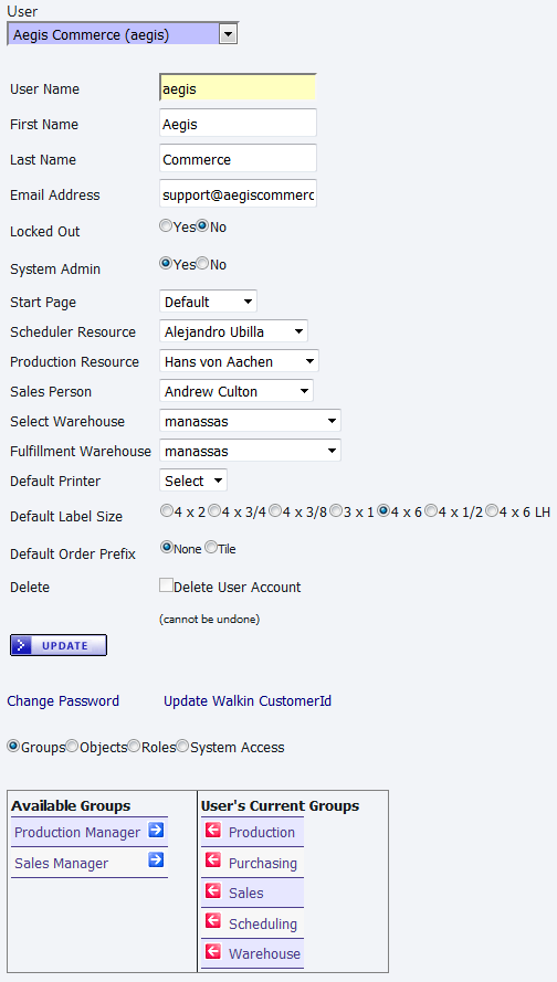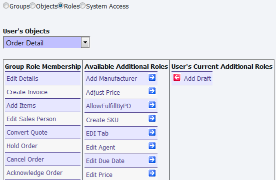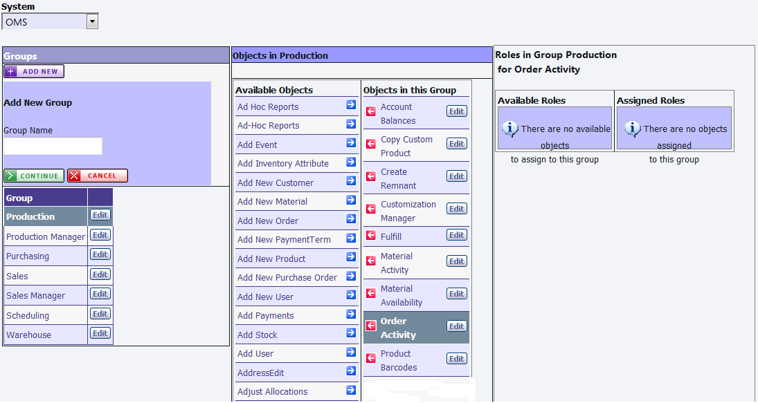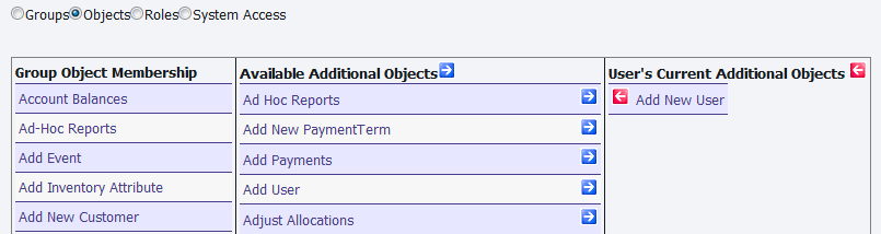 From this screen you can assign the Group, Objects and Roles to the users who are not system Administrators. The system administrator will have rights to all the groups and objects in the system.