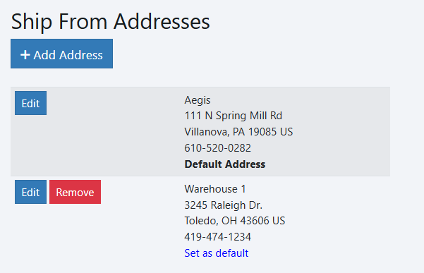 You can add as many addresses as needed, but one must be the default. There must always be at least one ship from address.