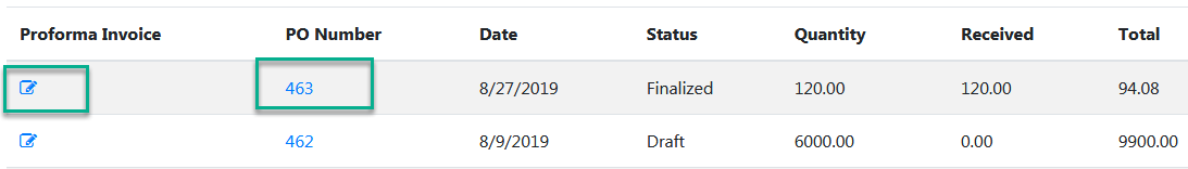 Click on icon under Proforma Invoice column, to go to the edit view of proforma invoice.