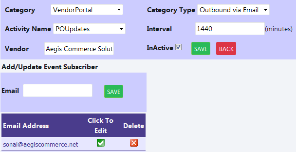 [1] Select Category "VendorPortal", Category Type "Outbound via Email", Activity Name "POUpdates", enter time interval (in minutes), enter vendor name and save