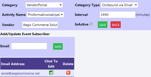 [1] Select Category "VendorPortal", Category Type "Outbound via Email", Activity Name "ProformaInvoiceUpdates", enter time interval (in minutes), enter vendor