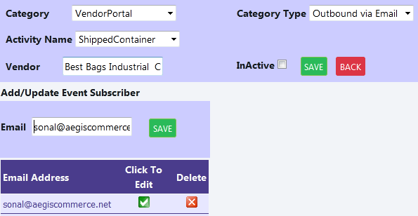[1] Select Category "VendorPortal", Category Type "Outbound via Email", Activity Name "ShippedContainer", enter vendor name and save the activity. Then add