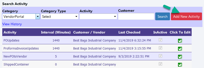 [1] Add New Activity to send new po alert via email. Select Category "VendorPortal", Category Type "Outbound via