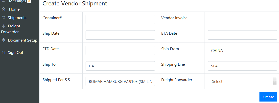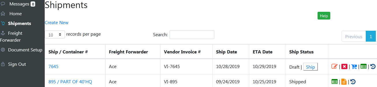 You can search data by Ship/Container number, Freight Forwarder, Vendor Invoice number, Ship date, ETA Date and Ship Status.