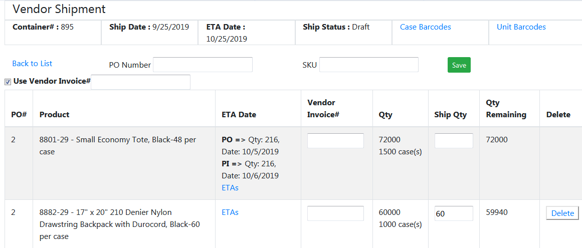 This page shows the shipments the Vendor has already created. The Shipments will have a Status of Draft or Shipped.