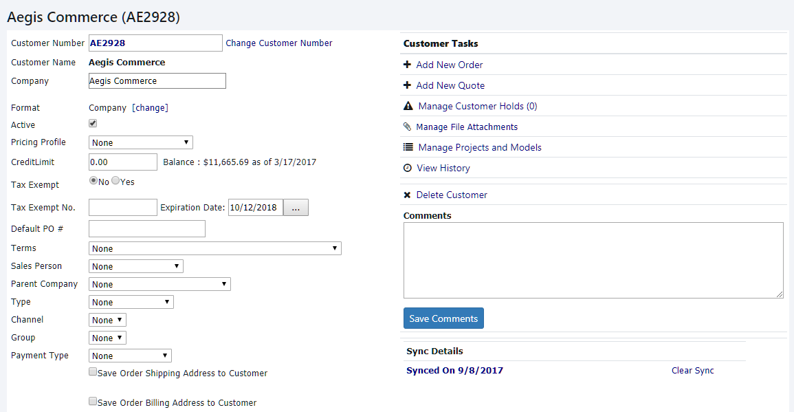 On Customer Details page, you can view and update the customer information like Pricing Profile, Payment Terms, Sales Person, Parent Company, Payment Type etc.
