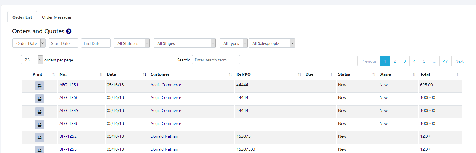 From the Order List, you can filter orders/quotes by date range, status, stage, type (order or quote), salesperson - and each column is sortable and searchable.